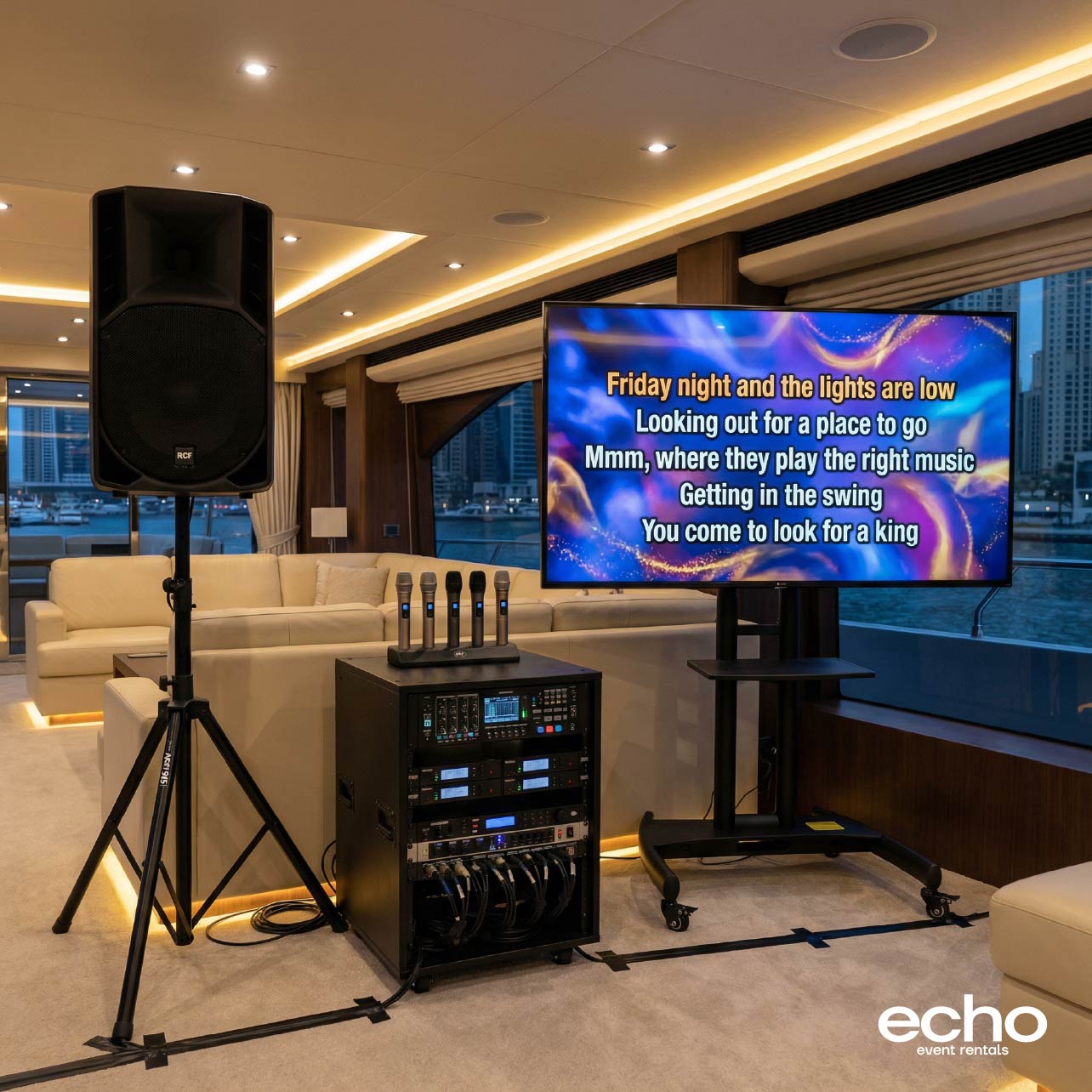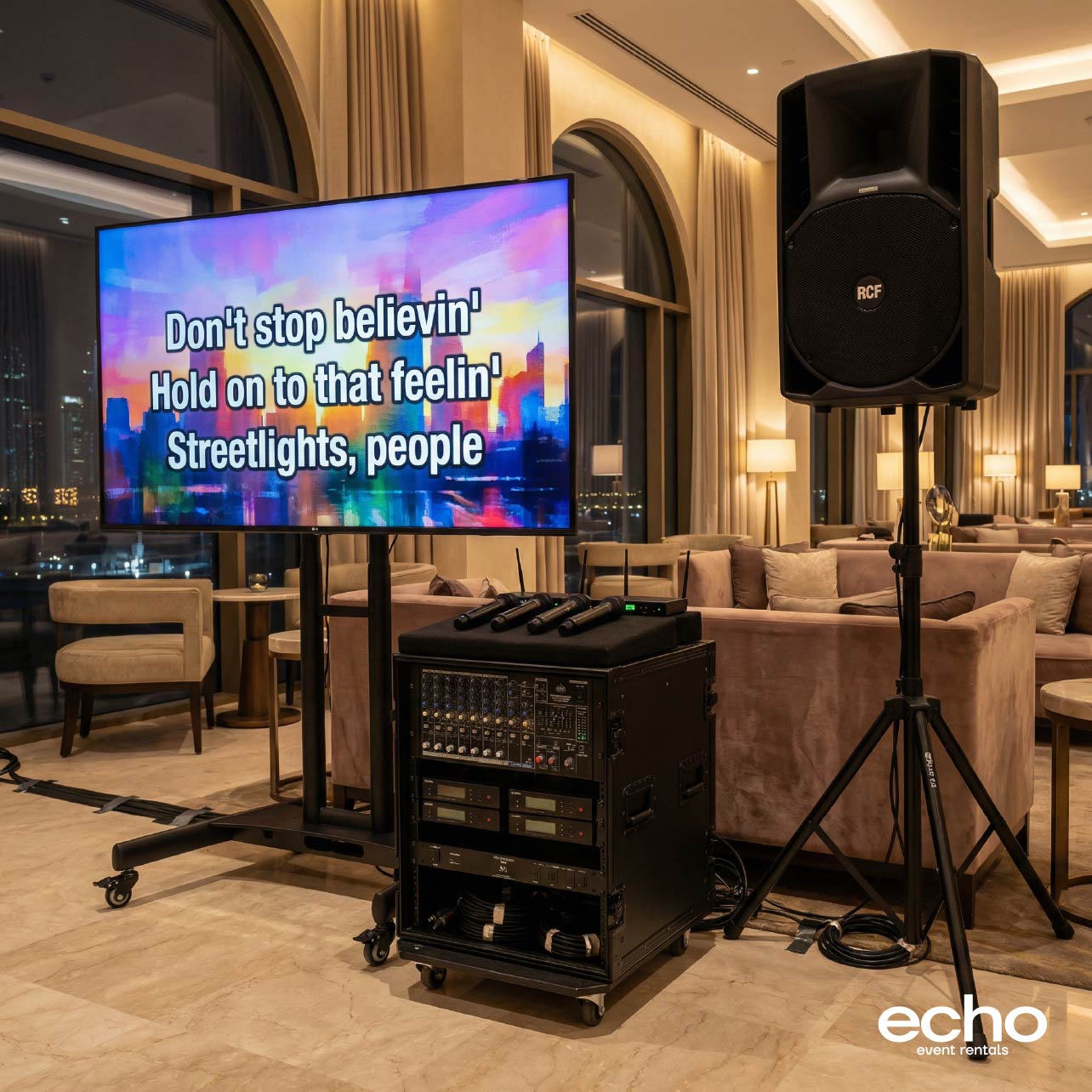 Every karaoke package from Echo Dubai comes with free delivery, full setup, and pickup within Dubai. Our crew handles all the wiring, sound checks, and screen positioning so everything is event-ready before your first guest walks in. We also deliver to Abu Dhabi, Sharjah, Ajman, Ras Al Khaimah, and Fujairah for an additional fee. Not sure what to look for in a rental? Read our karaoke rental guide first.